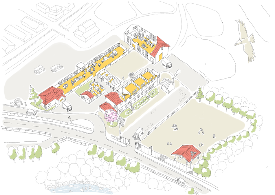 本プロジェクト「(仮称)シンゴーハン」は、その中核を担う合板製造・内装材加工拠点として位置づけられ、木曽から都市への木材流通の起点であり、森と都市の持続可能なつながりを実装するモデルとなることを目指します。